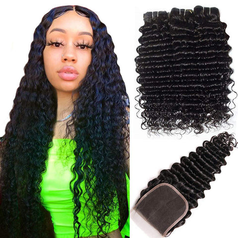 Deep Wave 3 Bundles with 4X4 Lace Closure 10A Virgin Human hair Can Make Into Wig for you
